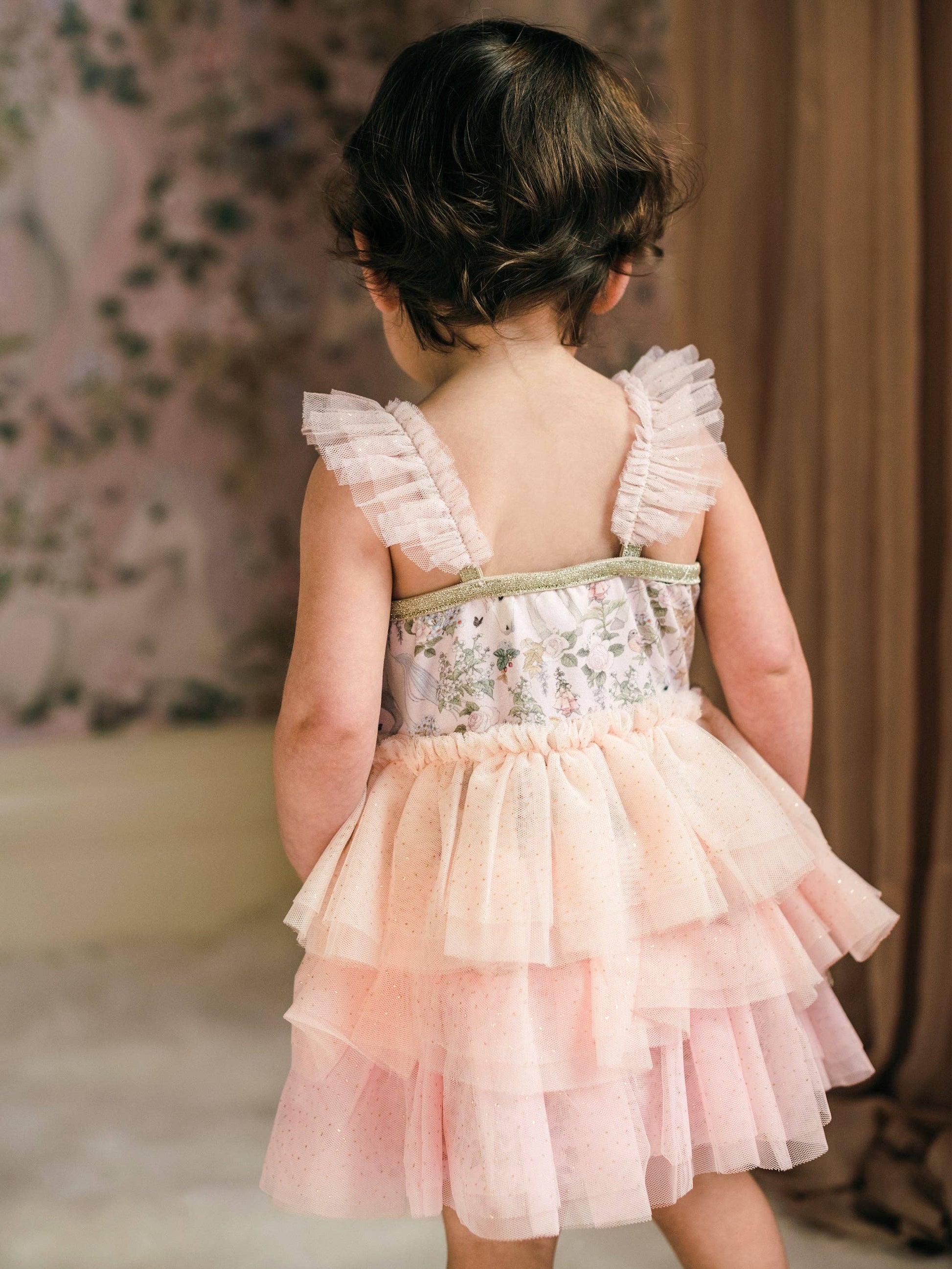 Delight in the enchantment of the Fleur Harris 'Field of Dreams' Flutter Tutu Dress for babies! This truly special dress will transport your little one's imagination to a world of fantasy. The skirt is crafted from soft layers of sparkling tulle in shades of peachy pinks. Fleur's 'Field of Dreams' artwork adorns soft cotton jersey for the skirt lining and singlet style bodice. Gold binding trim and sparkling tulle flutter straps complete the magnificence of this magical dress. It's perfect for special occasions, fairy tea parties and everything in between!