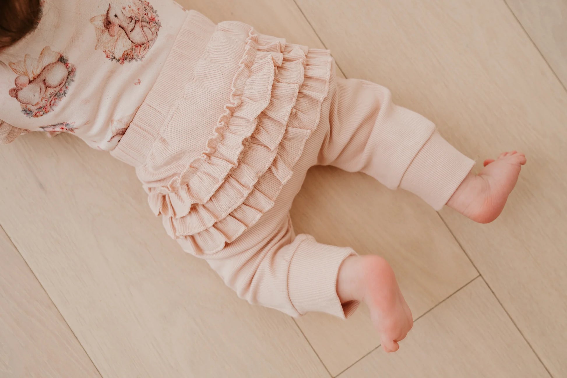 The Frilly Slouch Pants in Rose are crafted from soft ribbed cotton, featuring a relaxed drop-crotch design and playful frilly details.