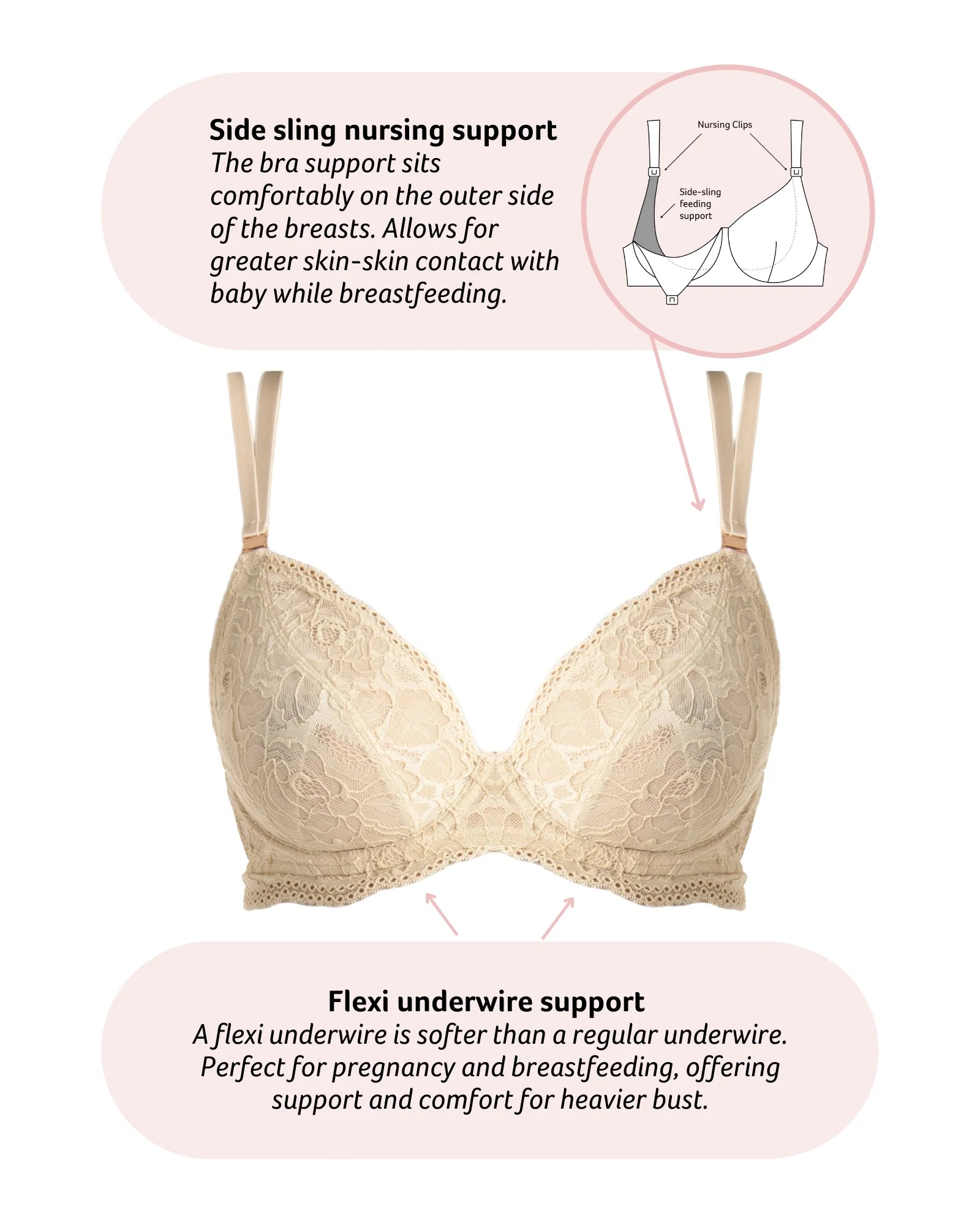 Who says practical can’t be powerful? This sexy plunge nursing bra delivers sheer lace drama, twin-strap detailing, and flexiwire support with supportive plunge styling—designed for mamas who want more than just function. Romantic, flattering, and surprisingly practical, with support for the larger busts.