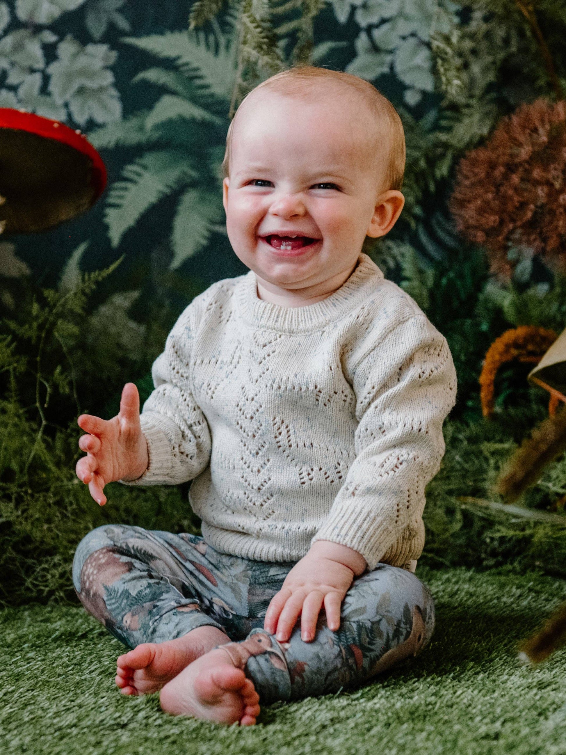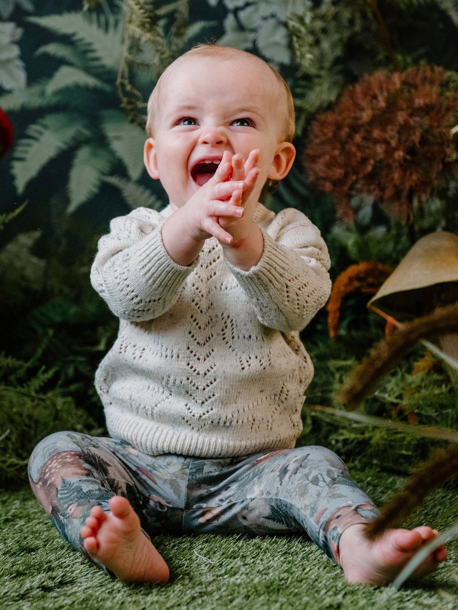 A delightful adventure awaits with the Fleur Harris 'In the Woods' Timeless Legging in the 'Dusty Blue' colour way. Beautiful detailed illustrations showcase magical woodland animals hiding amidst a lush forest. These leggings have been created in soft cotton stretch jersey for comfort at play, or perfect for your tiny cub to curl up and take a nap in.