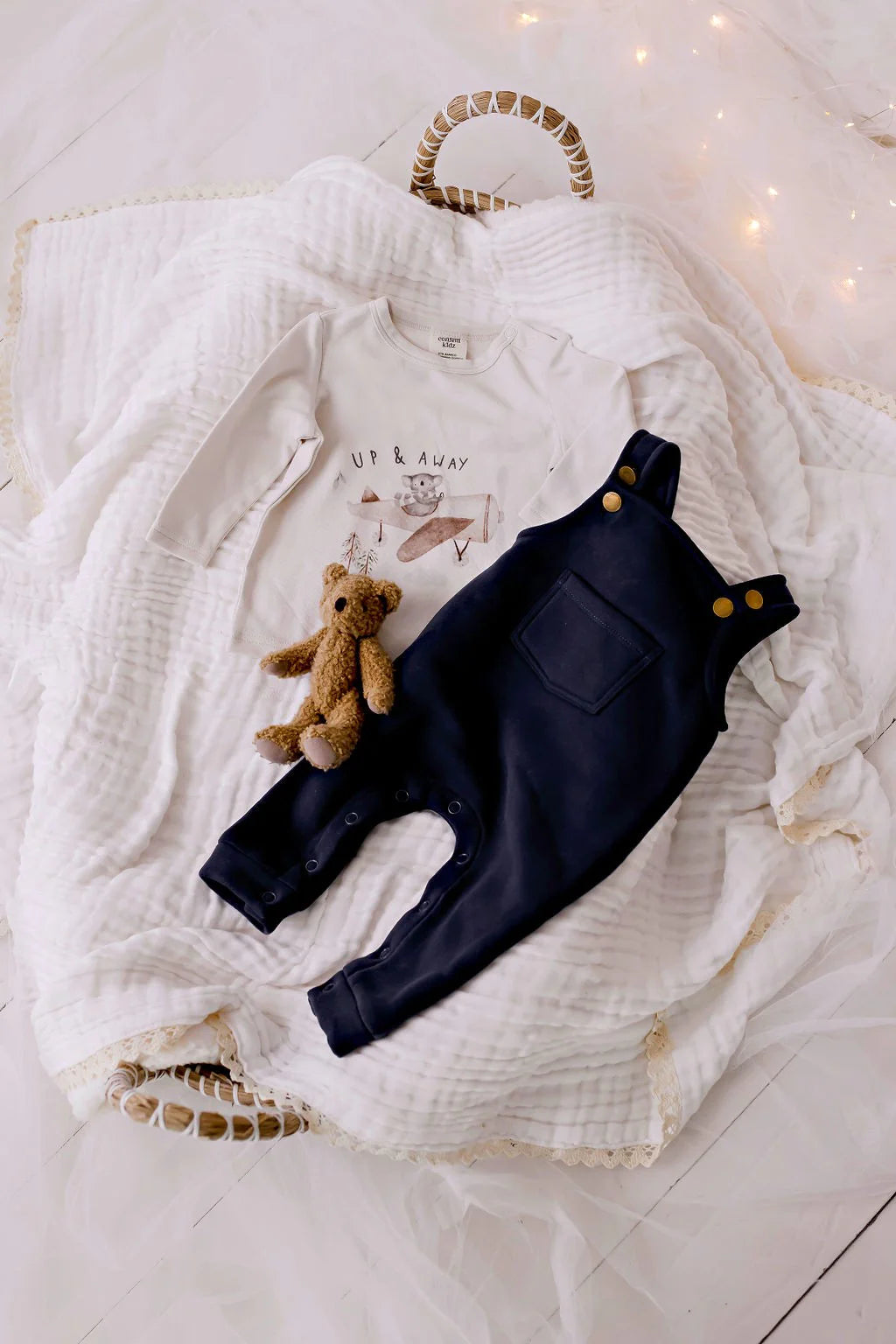 The Up and Away Placement Tee features an adorable design and is made from soft, warm organic cotton and bamboo. It pairs perfectly with our Ribbed Pants in Mustard for a cosy, coordinated look.