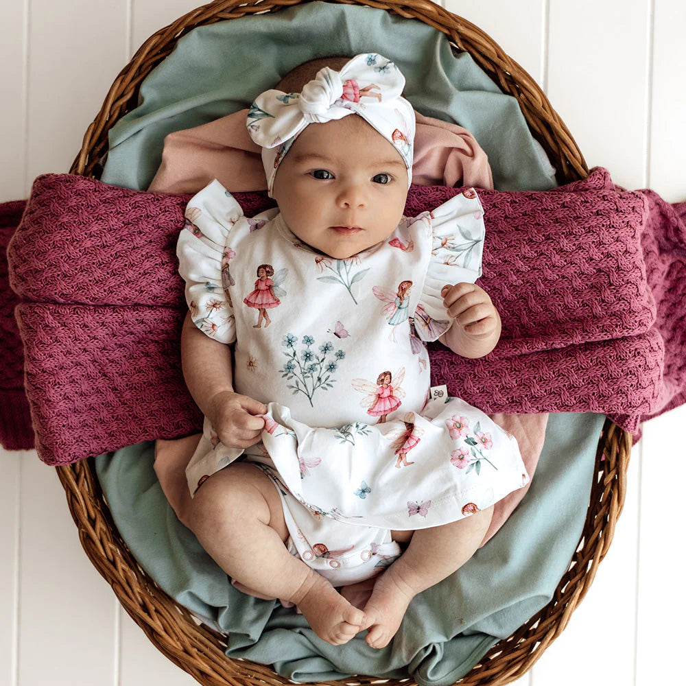 Soft and stretchy, our dresses are easy-care and very comfy for bub. The sizes up to and including size 1 come with a snap underbody to go over a nappy. Size 2 and up doesn't have the snap body feature. We have really focused on the details and ensured the dresses up to size 1 are short enough so that a baby can crawl and not trip over the skirt. Size 2 and over, when they're walking, is a bit longer.