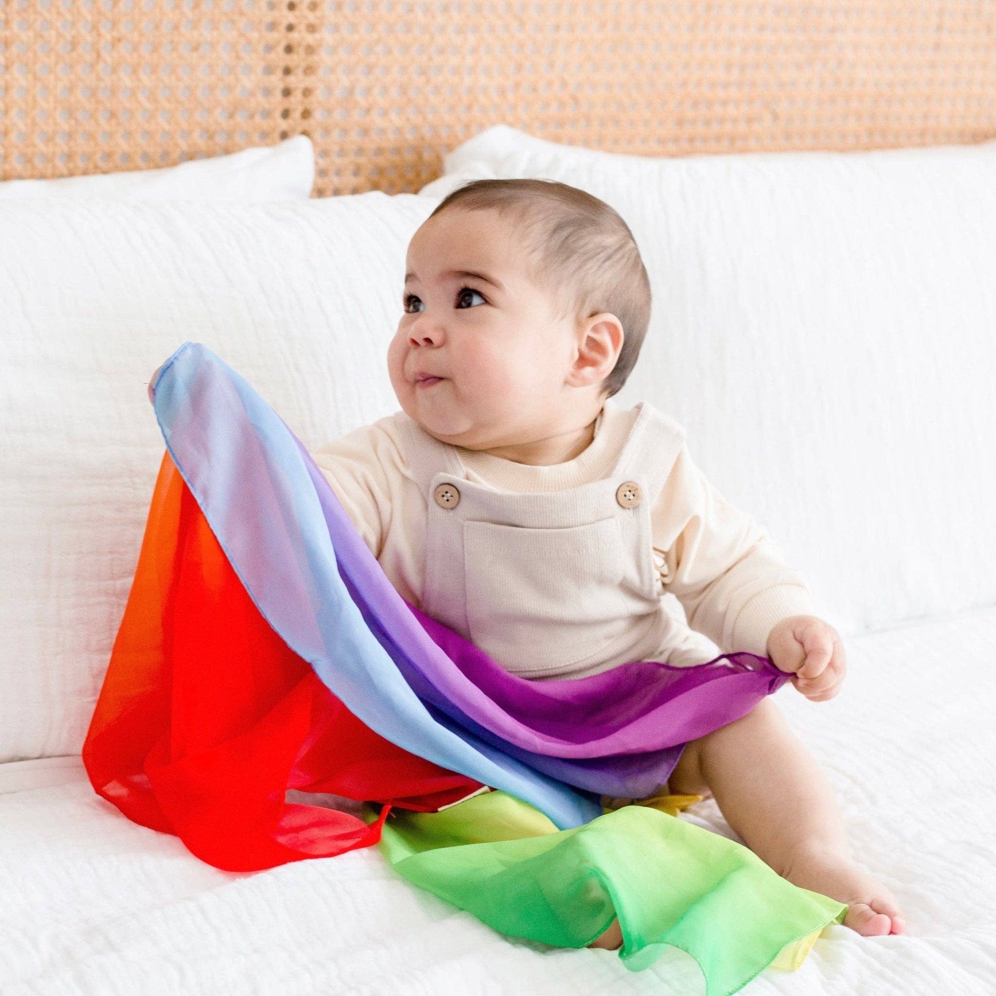 Soft, floaty, and endlessly open-ended. Toddlers use silks for dancing, peekaboo, wrapping, and pretend play. This set of three silks helps toddlers play creatively and fosters body awareness and sensory confidence.