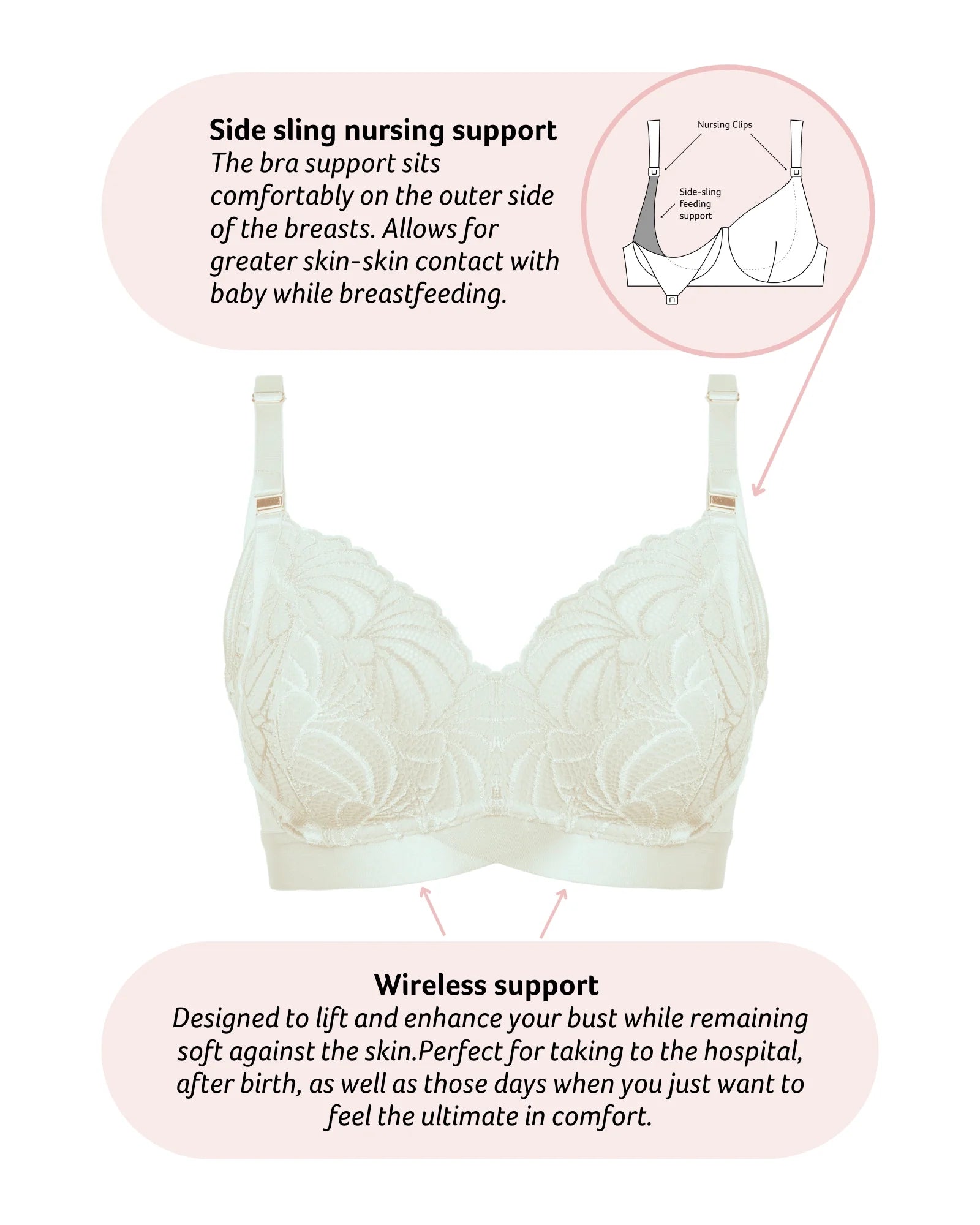Confidence is sexy! Warrior 2.0 Multifit nursing bra is the viral sensation that’s redefining maternity and motherhood lingerie.Crafted from beautiful ivory recycled lace merges bold style with exceptional wirefree comfort. Its non-padded dual-cup sizing adjusts to fit throughout pregnancy and postpartum. With rose gold magnetic clips, a side sling for skin-to-skin contact, and luxe details, it offers both confidence and comfort.